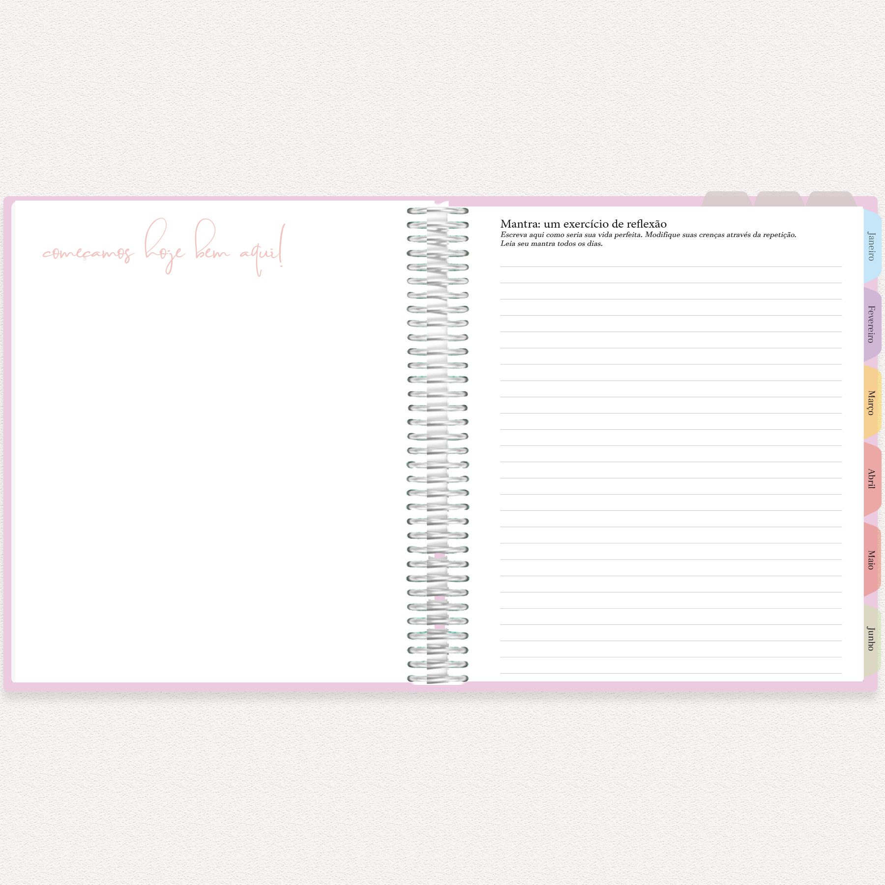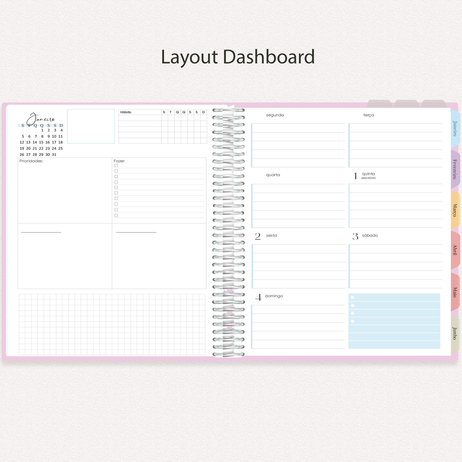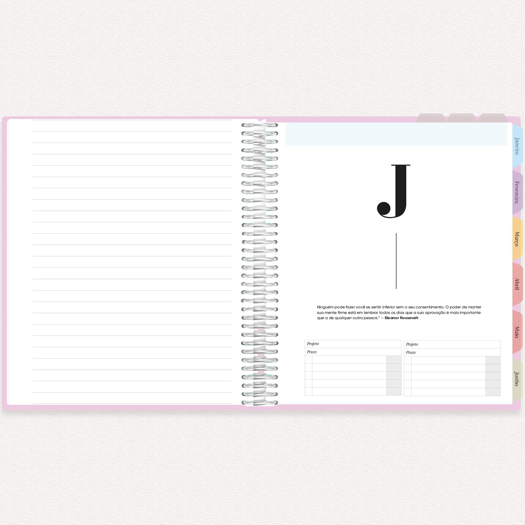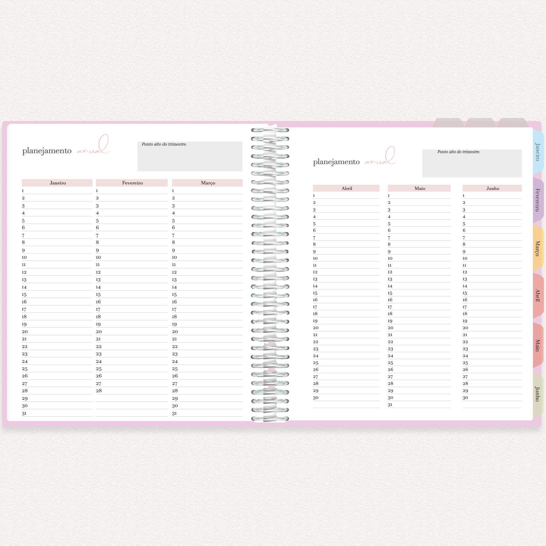 Divisória Mensal com Planejamento: No verso de cada divisória de mês, um espaço para planejamento mensal geral, permitindo uma visão macro dos compromissos, metas e eventos.