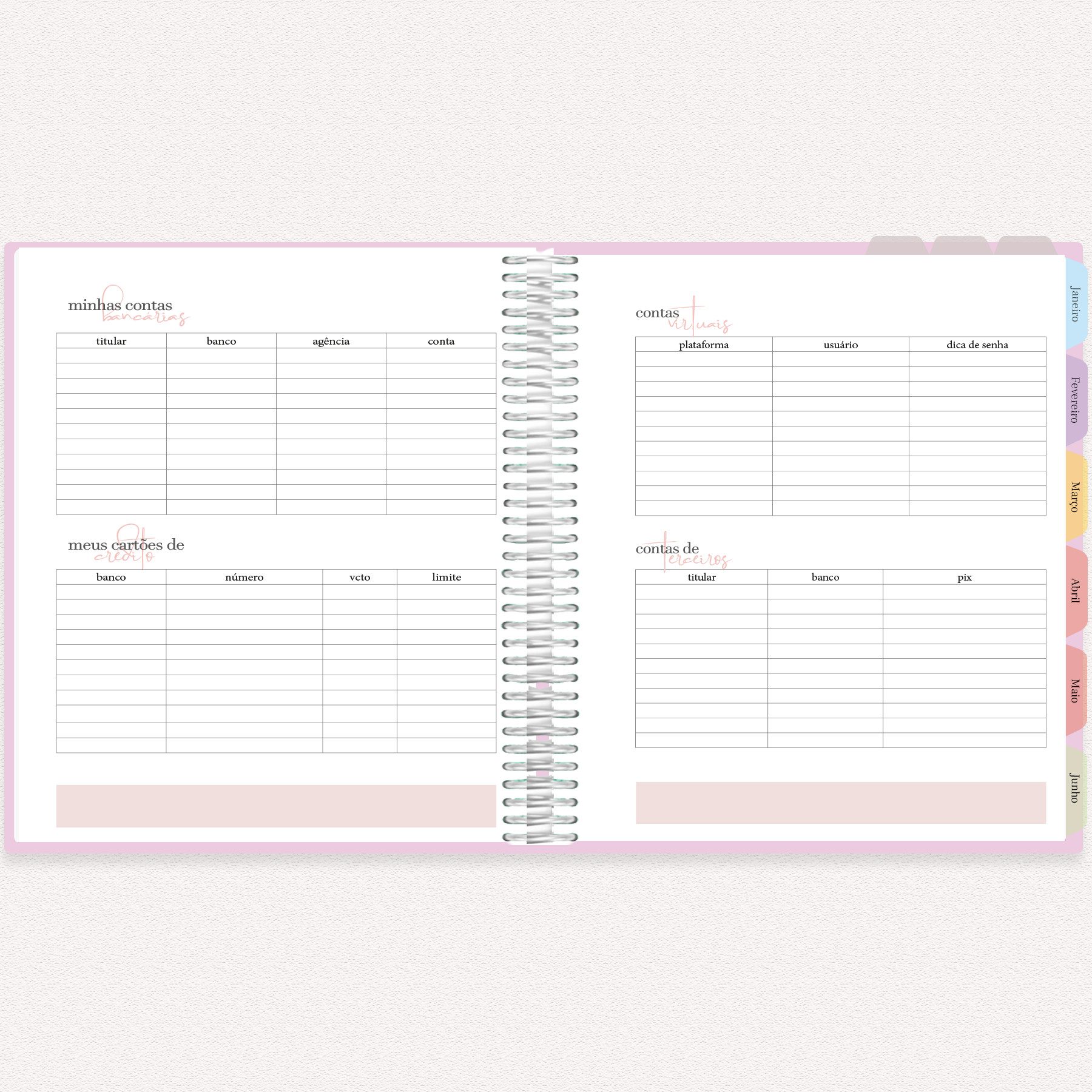 Controle Financeiro Mensal:  Ao final de cada mês, duas páginas para organizar entradas, saídas, poupanças, investimentos e demais detalhes financeiros.